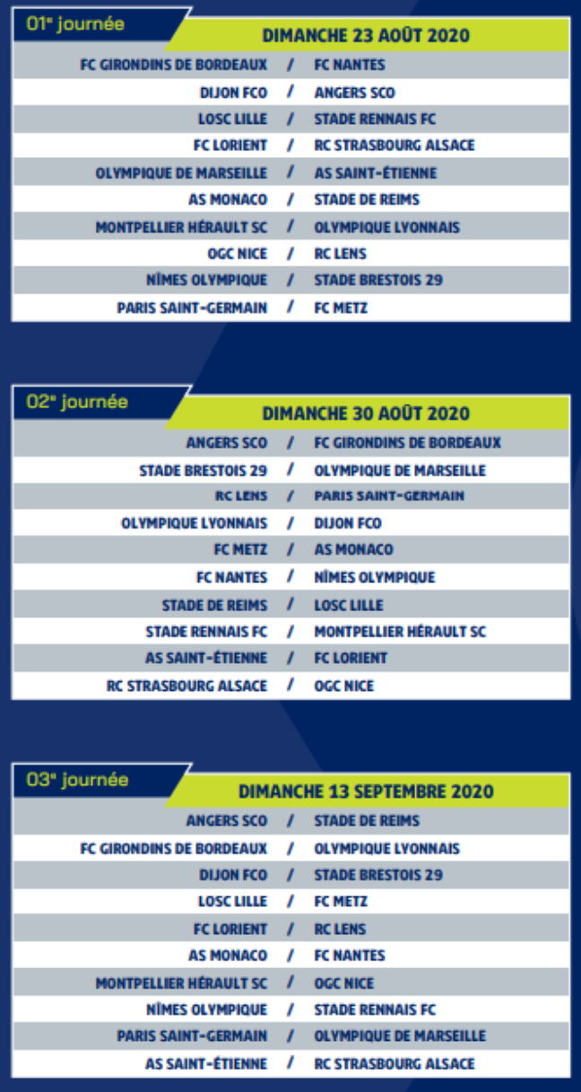 La lfp a dévoilé ce vendredi le calendrier complet de la ligue 1 pour la saison 2019 2020. Site officiel de l olympique de marseille. Aller 1ère journée vendredi 10 août 20h45. Début des hostilités le 10 août à 17h30 au stade vélodrome.