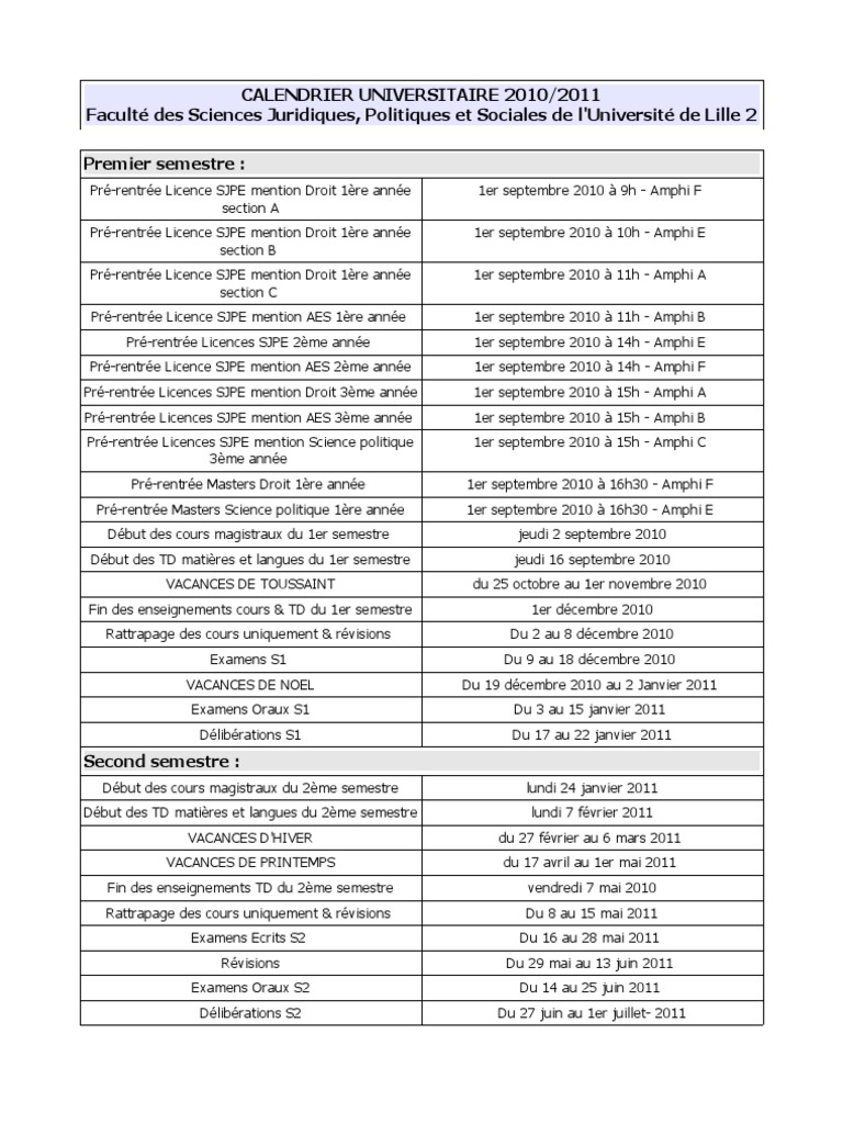 Calendrier Universitaire 2010 2011 Faculte Des Sciences Juridiques